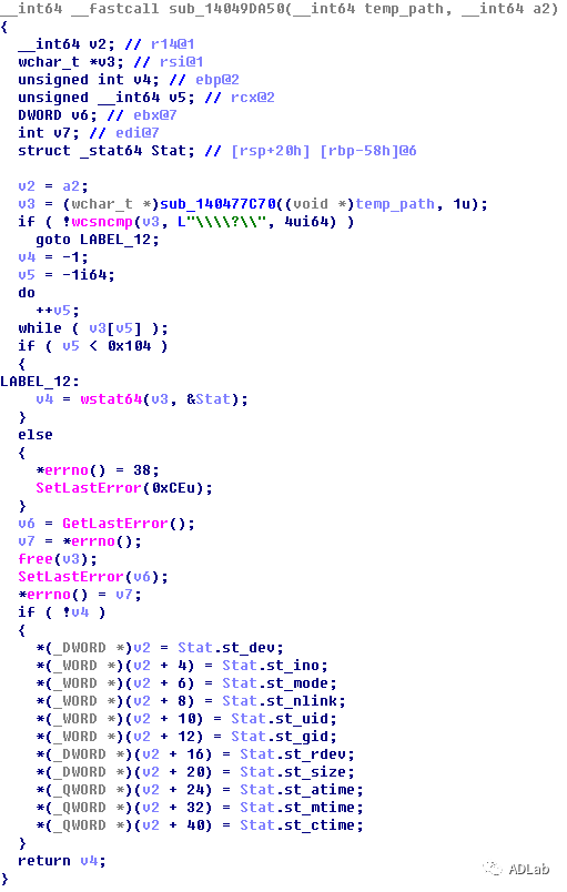 Ê×ÏÈ£¬£¬£¬º¯Êýsub_14049DA50ͨ¹ýsub_140477C70¶Ô×Ö·û´®¾ÙÐÐÁË´¦Öóͷ£¡£¡£¡£¡£¡£È»ºó£¬£¬£¬Å²ÓÃwstat64»ñÈ¡ÏìӦ·¾¶µÄÎļþ״̬£¬£¬£¬ÈôÊÇÀֳɻñÈ¡ÔòÉúÑĵ½Ò»¸ö½á¹¹ÌåÖУ¬£¬£¬²»È»·µ»Ø0xffffffff¡£¡£¡£¡£¡£ÓÉÓÚTempĿ¼Ï²¢Î´·¢Ã÷±¸·ÝÎļþ£¬£¬£¬µ¼Ö»ñȡ״̬ʧ°Ü£¬£¬£¬´Ó¶ø·µ»Ø0xffffffff¡£¡£¡£¡£¡£