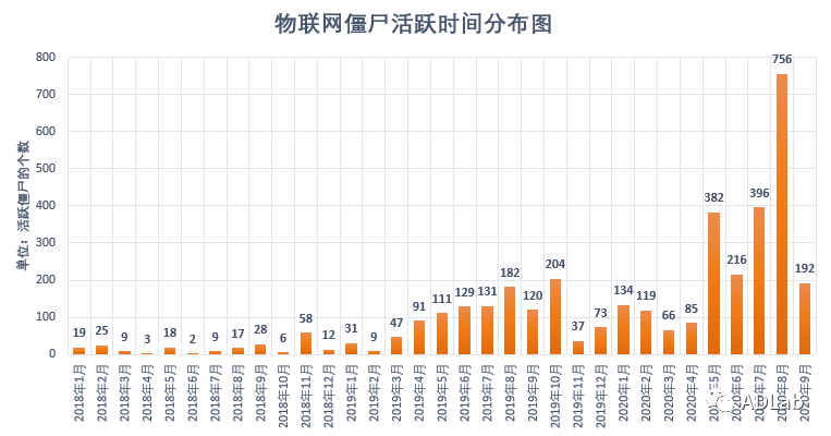 ÎÒÃǶÔÕâЩÑù±¾µÄ»îÔ¾ÊýÄ¿ºÍ»îԾʱ¼ä¾ÙÐйØÁªÍ³¼Æ£¬£¬»æÖÆÁËÎïÁªÍø½©Ê¬»îԾʱ¼äÂþÑÜͼ£¬£¬¼ûͼ6¡£¡£¡£¡£´ÓÕâÅúÑù±¾µÄ¹¥»÷ʱ¼äÀ´¿´£¬£¬ÖÁÉÙ´Ó2018Äê1ÔÂ×îÏÈ£¬£¬¹¥»÷Õß¾Í×îÏÈʹÓÃGafgyt¡¢Mirai×齨ÎïÁªÍø½©Ê¬ÍøÂ磬£¬È»ºóʹÓÃ×齨ºÃµÄ½©Ê¬ÍøÂç¾ÙÐÐDDoS¹¥»÷IJÀû¡£¡£¡£¡£2019Äê3Ô¹¥»÷×îÏÈ»îÔ¾£¬£¬2019Äê10Ô·ºÆðÁËÒ»¸öСá¯Á룬£¬¹¥»÷µÄ×îá¯ÁëÔò·ºÆðÔÚ2020Äê8Ô¡£¡£¡£¡£