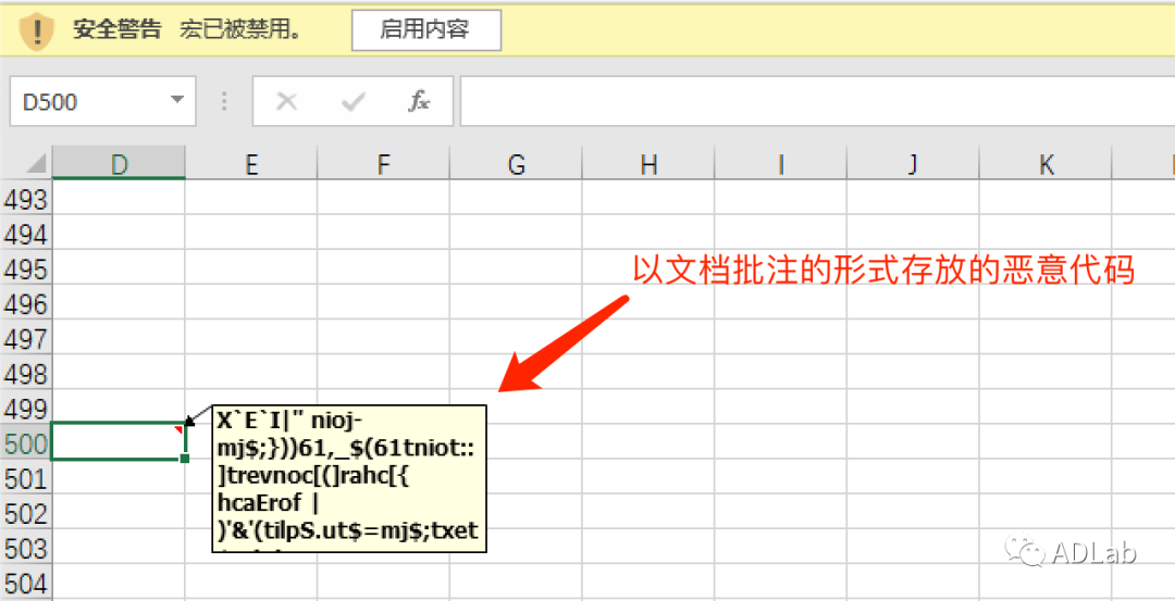 ¶ñÒâ´úÂë±»¼ÓÃÜÉúÑÄÔÚÓÕ¶üÎĵµexcel±í¸ñµÄD500µ¥Î»¸ñµÄÅú×¢ÖУ¨¼ûͼ19£©¡£¡£¡£¡£ÔÚÒÔÍùµÄ´ËÀ๥»÷ÖУ¬£¬¹¥»÷Õß´ó¶à½«¶ñÒâ´úÂë»òÊý¾Ý´æ·ÅÔÚexcelµç×Ó±í¸ñµÄµ¥Î»¸ñÄÚÈÝÖÐÒþ²ØÏÔʾ,»òÕßÒþ²Øµ½VBA¹¤³ÌÖеÄÓû§¿Ø¼þÀ£¬Ò²Óкڿͽ«¶ñÒâ´úÂë·ÅÈëÎĵµµÄÄÚ½¨ÊôÐÔÖС£¡£¡£¡£¶øÔÚ±¾´Î¹¥»÷ÖУ¬£¬¹¥»÷Õß½«¶ñÒâ´úÂë¼ÓÃÜ´æ·ÅÔÚÁ˵ç×Ó±í¸ñ¿Õȱµ¥Î»¸ñµÄÅú×¢ÄÚÈÝÀ£¬ÕâÖÖ¶ñÒâ´úÂëÒþ²Ø·½·¨ÔÚ´ËÀ๥»÷ÖÐÕÕ¾ÉÊ״ηºÆð¡£¡£¡£¡£
