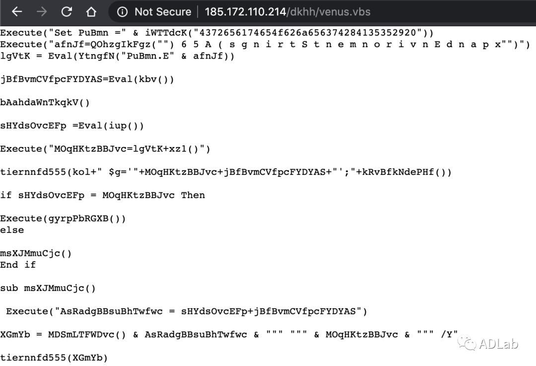×îºóÖ´ÐеĶñÒâ´úÂëÊÇͼ21ËùʾµÄÒ»¸öPowershell¾ç±¾£¬£¬²»¹ý¸Ã¾ç±¾Ö´ÐеÄÏÂÁî×öÁË×Ö·û»ìÏý´¦Öóͷ£¡£¡£¡£¡£¾ç±¾ÔÚÖ´ÐÐʱÏÈÊǽ«»ìÏý¹ýµÄ×Ö·û´®×ª»»³É×Ö·ûÊý×飬£¬È»ºóŲÓÃReverseº¯ÊýÄæÐòÅÅÁиÃ×Ö·ûÊý×飬£¬ÔÙ½«ÄæÐòºóµÄ×Ö·ûÊý×鯴½Ó³É×Ö·û´®£¬£¬ºóÃæµÄ²Ù×÷Êǽ«×Ö·û´®ÖеÄÌî³ä×Ö·û¡®&¡¯È¥µôÔÙת»¯³É16½øÖƱàÂë¡£¡£¡£¡£¾ÓÉÕâÑùµÄ¼¸²½´¦Öóͷ££¬£¬Ö´ÐÐÏÂÁî¾Í±»»¹Ô³öÀ´ÁË£¨¼ûͼ22£©£¬£¬´Óͼ22ÖÐÎÒÃÇ¿ÉÒÔ¿´µ½¸ÃPowershell¾ç±¾ÏÖʵÉÏÊÇÒ»¸öÏÂÔØÆ÷£¬£¬Ëü»á´ÓÔ¶³ÌЧÀÍÆ÷http://185.172.110.214/dkhh/venus.vbsÉÏÏÂÔØÒ»¸öVBSÎļþÀ´Ö´ÐС£¡£¡£¡£