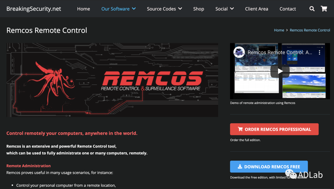 ×Ô2016ÄêÔÚ°µÍøÉϵĵØÏºڿÍÉçÇø×îÏȳöÊÛÒÔÀ´£¬£¬Remcos RATºÜÊÇ»£»£»îÔ¾£¬£¬»ù±¾ÉÏÿ¸öÔ¶¼»áÐû²¼Á½¸ö×óÓÒµÄа汾¡£¡£¡£¡£Æä¾ßÓмüÅ̼ͼ¡¢ÆÁÄ»¼Í¼¡¢Å²ÓÃÉãÏñÍ·ºÍÂó¿Ë·ç¾ÙÐмÏñ¼Òô¡¢Ô¶³ÌÖ´ÐÐShellÏÂÁî¡¢Ô¶³ÌÖ´Ðо籾¡¢ÉÏ´«ÎļþÒÔ¼°ÏÂÔØÎļþµÈ¹¦Ð§¡£¡£¡£¡£¸Ã¹¤¾ßÓÉÒ»¼ÒÃûΪBreakingSecurityµÄ¹«Ë¾¿¯ÐгöÊÛ£¬£¬Í¼27ÊÇRemcos RATµÄ¹ÙÍø½çÃæ¡£¡£¡£¡£Í¨¹ý¹ûÕæµÄÐÅÏ¢¿ÉÒÔ·¢Ã÷£¬£¬ÆäÒѱ»ºÚ¿ÍƵÈÔµØÊ¹ÓÃÔÚÖÖÖÖ¹¥»÷»î¶¯ÖС£¡£¡£¡£