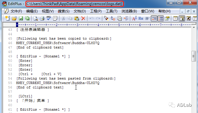 Remcos RATľÂí»áÆô¶¯¼üÅ̼ͼÏß³ÌÀ´ÇÔÈ¡ÊÜѬȾÖ÷»úµÄ¼üÅÌÊäÈëÐÅÏ¢ºÍ¼ôÇаåÊý¾Ý¡£¡£¡£¡£Ä¾Âí½«ÇÔÈ¡µÄÕâЩÐÅÏ¢ÉúÑÄÔÚÍâµØÎļþ¡°%Appdata%\remcos\logs.dat¡±ÖС£¡£¡£¡£ÔÚÒÔǰµÄÓÐЩ°æ±¾ÖÐlogs.datÎļþÊǼÓÃܵ쬣¬²»¹ýÔÚ´Ë´ÎÎÒÃÇÆÊÎöµÄÕâ¸ö°æ±¾ÖÐlog.datÎļþûÓмÓÃÜ£¬£¬Êý¾ÝµÄ¼Í¼ÃûÌúÍ֮ǰµÄ°æ±¾»ù±¾ÀàËÆ£¨Èçͼ34£©£¬£¬Ä¾ÂíºóÐø»á½«ÍøÂçµ½µÄÕâЩ¼Í¼ÈÕÖ¾·¢Ë͵½C&CЧÀÍÆ÷¡£¡£¡£¡£